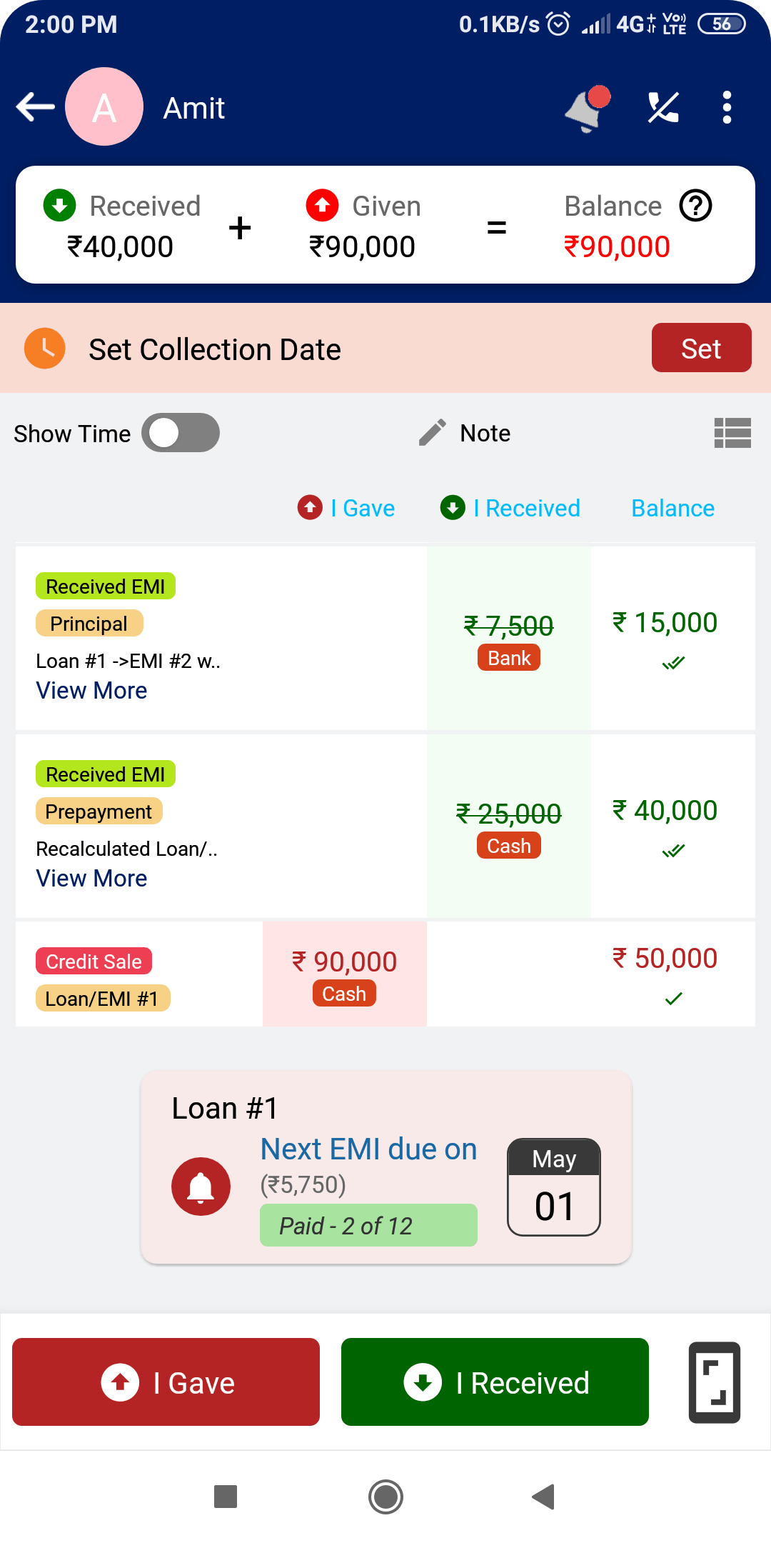 Loan Amount, EMI Received linked to Cash/Bank/Wallet account